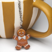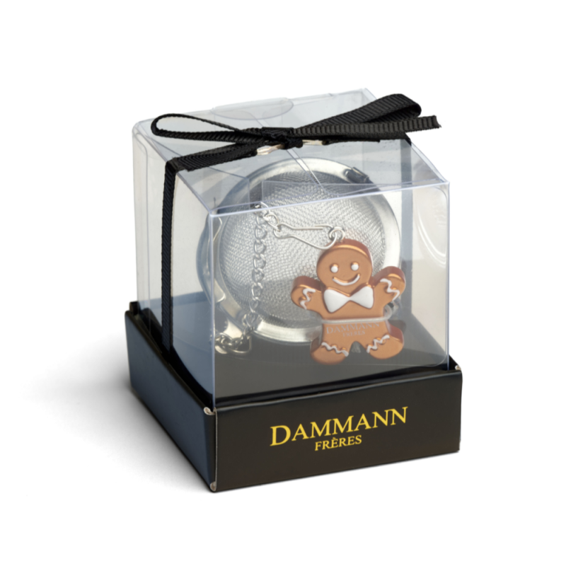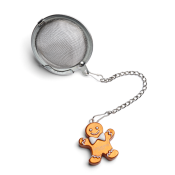 Un originale infusore a sfera, decorato con un simpatico omino di pan di zenzero in resina fissato all’estremità della catenella.